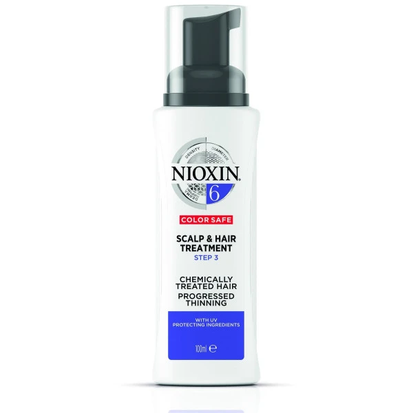 Protégez et rafraîchissez votre cuir chevelu avec leSoin Scalp & Hair Treatment du Système en 3 parties n°6 de Nioxin pour cheveux très fins et traités chimiquement. Ce soin sans rinçage pour cheveux et cuir chevelu a spécialement été développé pour les cheveux avec alopécie avancée. Grâce à la technologie Scalp Access 2.0, ce soin augmente le diamètre, évite la chute de cheveux due aux cheveux cassants, tout en assainissant le cuir chevelu. Le soin Scalp & Hair de Nioxin est la dernière étape du 3-part System, conçu pour renforcer les cheveux et augmenter la structure capillaire.
