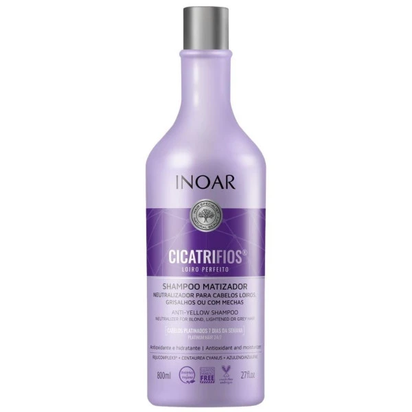Shampooing blonde Cicatrifios Inoar, spécialement formulé pour neutraliser les reflets jaunes sur les cheveux blonds, gris ou méchés.