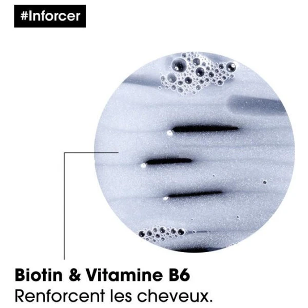 Le shampooing Inforcer Série Expert de L’Oréal Professionnel est connu pour répondre aux besoins des cheveux abimés, secs et cassants. Sa mission ? Débarrasser le cuir chevelu et les longueurs des impuretés accumulées tout au long de la journée tout en redonnant aux cheveux la force qu’il leur manque. Formulé à partir de vitamine B6 et en biotine, l’utilisation fréquente du shampooing Inforcer nourrit le cheveu sans l’alourdir. La fibre capillaire est soignée, plus élastique, et donc moins sujette à la casse. Les vitamines B6 accélère la production de kératine et favorise une croissance saine du cheveu.